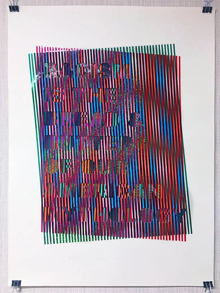 Propaganda Posters are a series of text-based works on paper using vinyl and gouache. The works use the oblique angle as a metaphor for marginality—they are nearly illegible from the dominant straight-on viewpoint but able to be read clearly from a 45 degree angle. Similar to power structures, when viewed from a privileged position, the structure seems invisible, however from the vantage point of any kind of marginality—BIPOC, female, queer, undocumented, disabled etc.—the power structure becomes obvious.