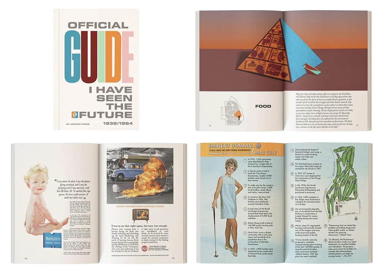 The book is a companion piece to a show of the same name at Field Projects and later expanded upon at the Shirley Fiterman Art Center (both NYC). Named for the slogan on pins that were available at General Motors’ “Futurama” in both 1939 and 1964, “I Have Seen the Future” is a multifaceted, immersive exhibit of components meant to evoke the experience of visiting the World’s Fair—with the hindsight of 2022. The book expands upon the themes tackled in the show through text and subverted advertisements. It emphasizes a worldview that hinges on interdependency—a concept all too foreign to the country that gave the world the cowboy, the pioneer, the action hero. With an eye on continuity, the book asks how the Space Race was not just a proxy for the Cold War, but for WWII, and a conflict that arguably is ongoing; it examines utopia as a violence that enforces segregation in myriad ways that define wealth and income distribution in America; it looks at how state surveillance harassed and even assassinated civil rights leaders to protect social order.
