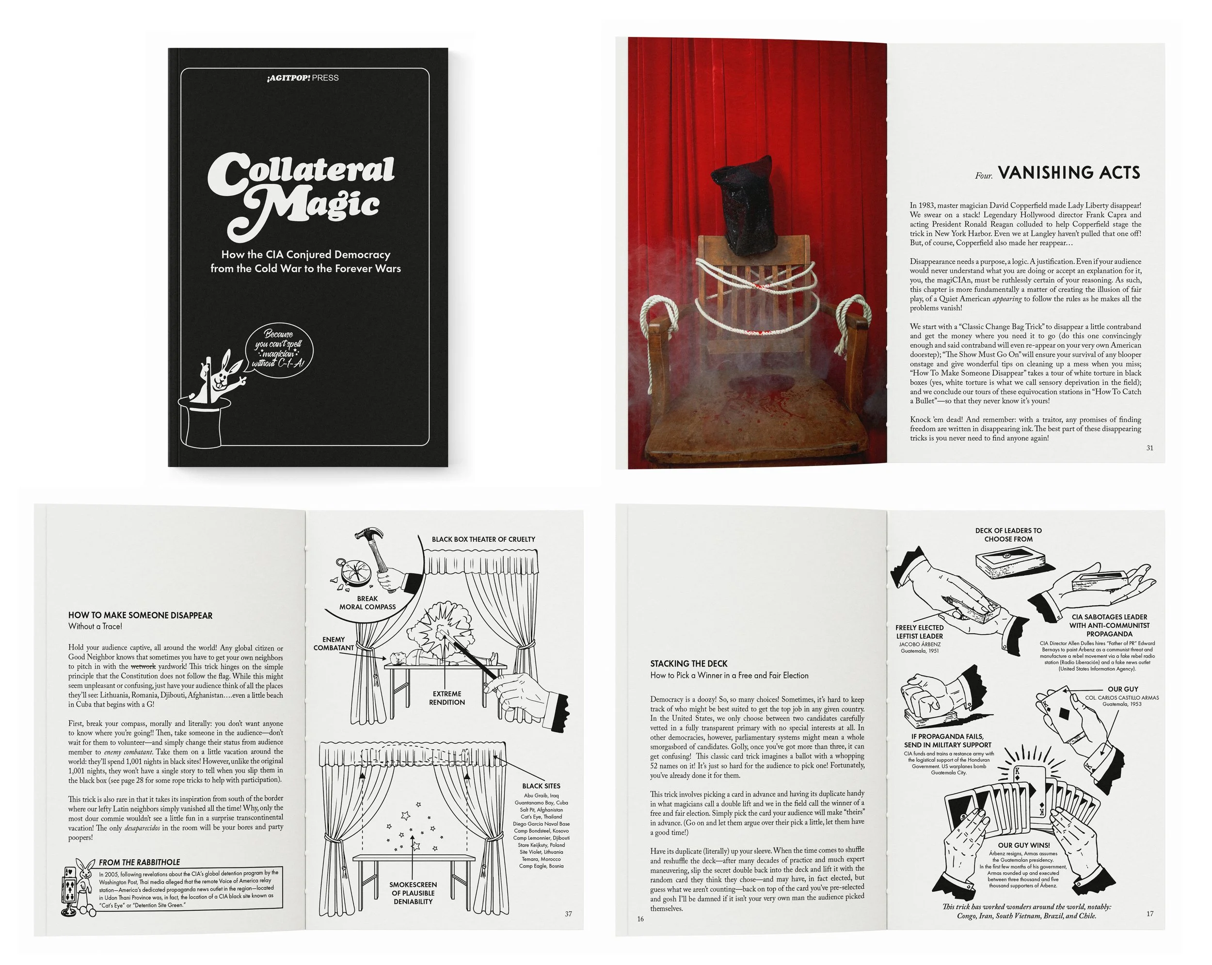 “Collateral Magic: How the CIA Conjured Democracy from the Cold War to the Forever Wars,” is a publication created in collaboration with writer Cara Marsh Sheffler. It satirizes a mid-century how-to amateur magician’s book, detailing the history of the CIA as if it were a series of tricks. Inspired by magician John Mulholland’s very real “CIA Manual for Trickery and Deception” (declassified in 1977), our book is a speculative analysis of magic in the field, tips and tricks on maintaining the illusion of democracy, and a friendly reminder that one cannot spell magician without C-I-A.