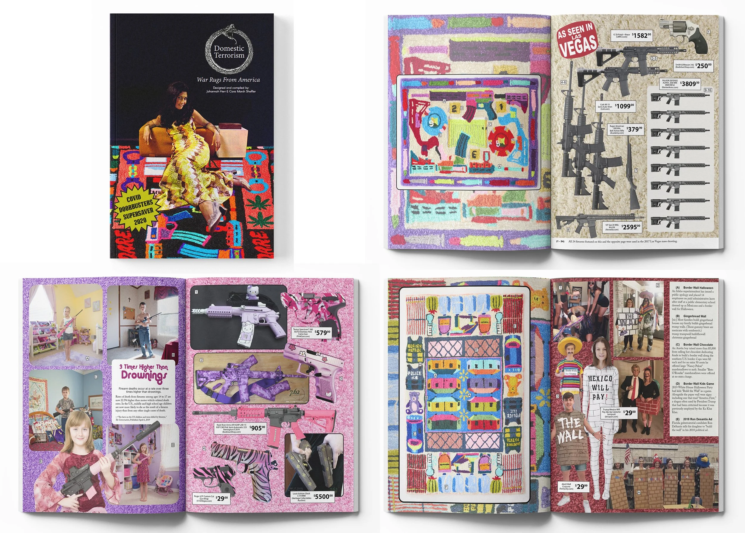 “Domestic Terrorism” is an artist book that grew out of my solo show of the same name, at Elijah Wheat Showroom in 2020. The show is comprised of a series of machine-tufted rugs that use the material and visual narrative strategies found in Afghan war rugs to depict state-sanctioned violence in America. Our book expands upon the motifs that the rugs explore (e.g., police brutality, the inept handling of the pandemic, immigration detention, gun violence, income inequality, environmental degradation) all in the cheery, exuberant format of a 70s-style Sears catalogue.