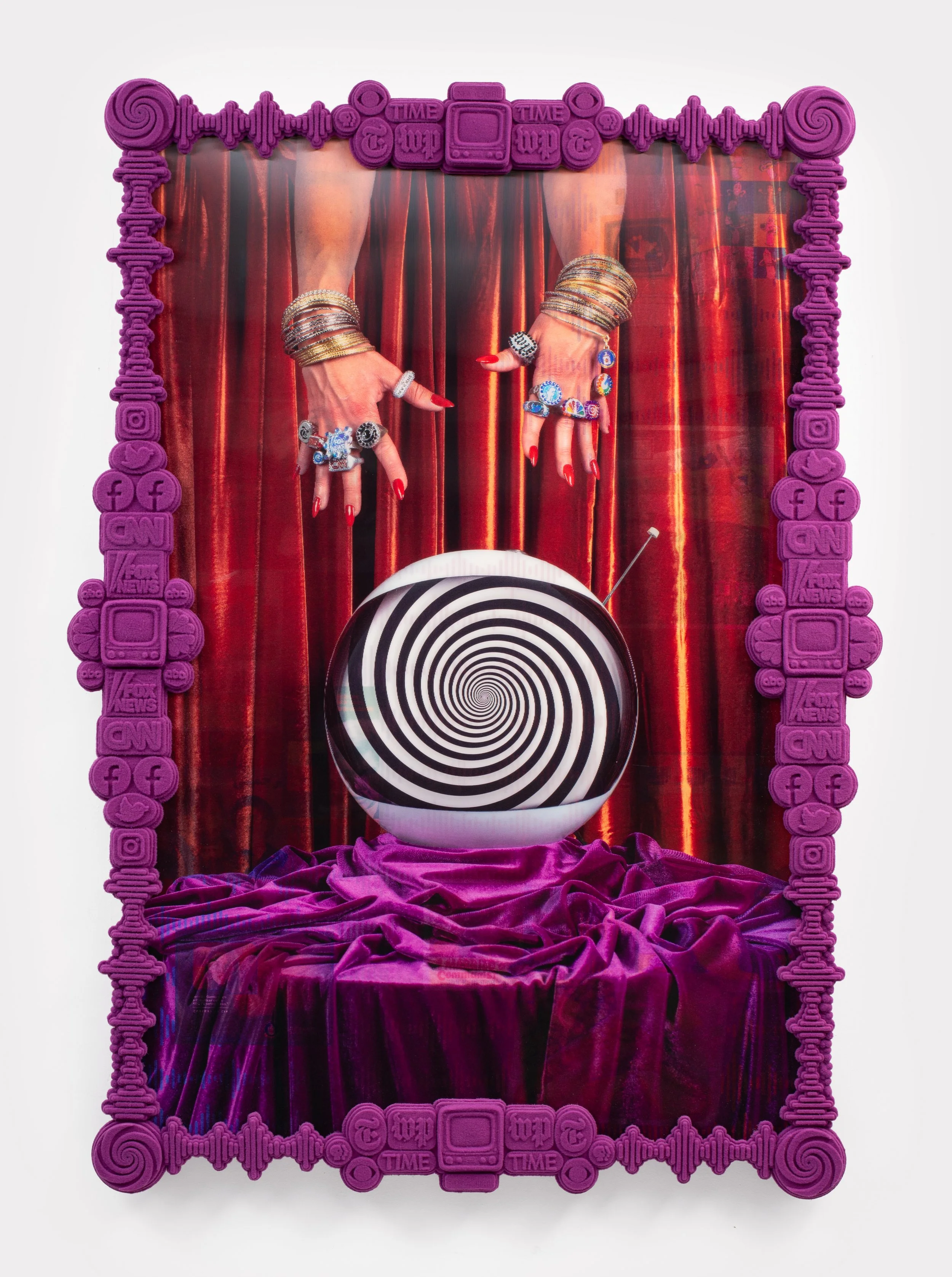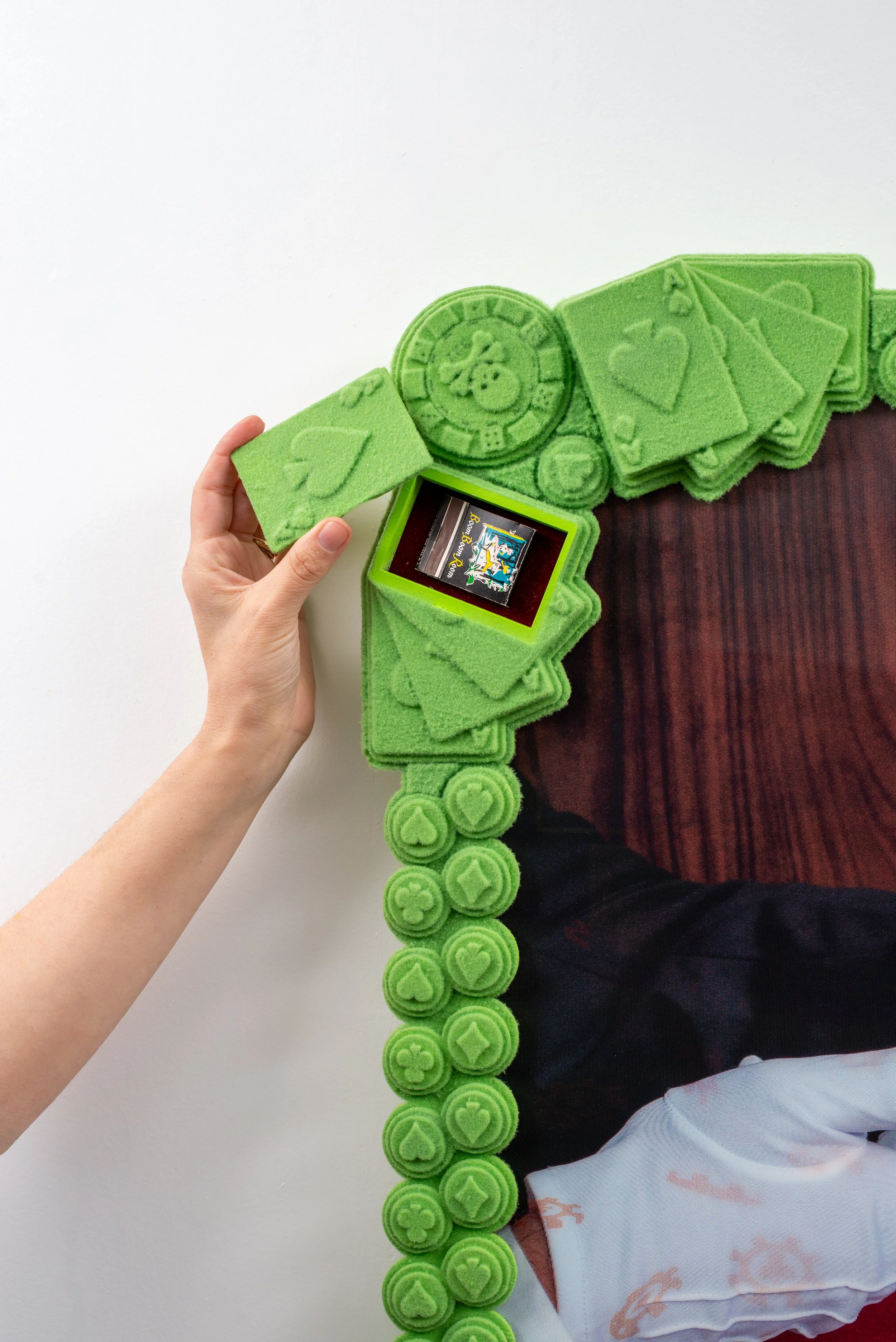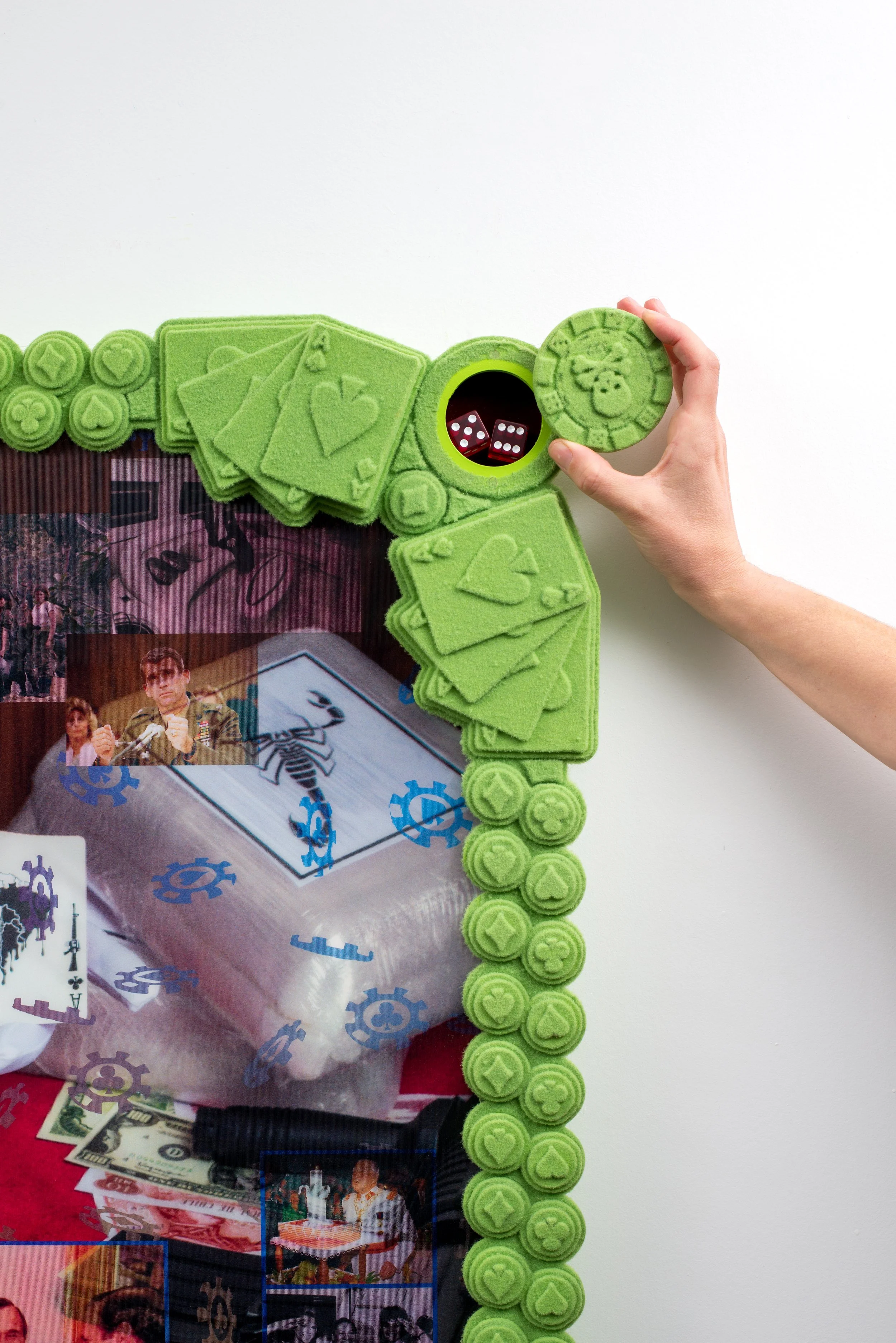 2025, 33in x 46in x 4in, lenticular print, nylon flocking, matchbook from Hotel Fontianblue’s Boom Boom Room, loaded dice, wood, plaster, magnets