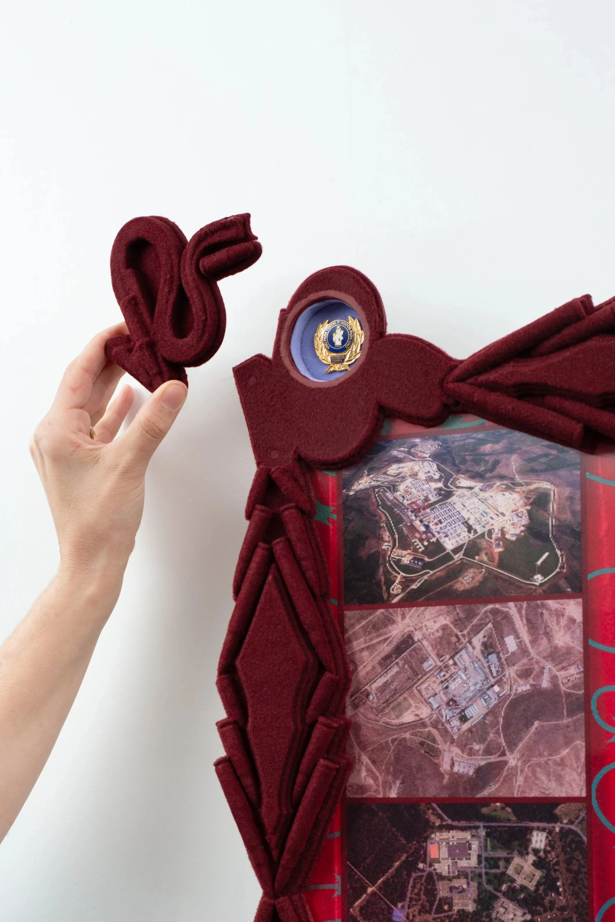 2025, 33in x 46in x 4in, lenticular print, nylon flocking, engraved bullet casing, School of the Americas instructor's pin, wood, plaster, magnets