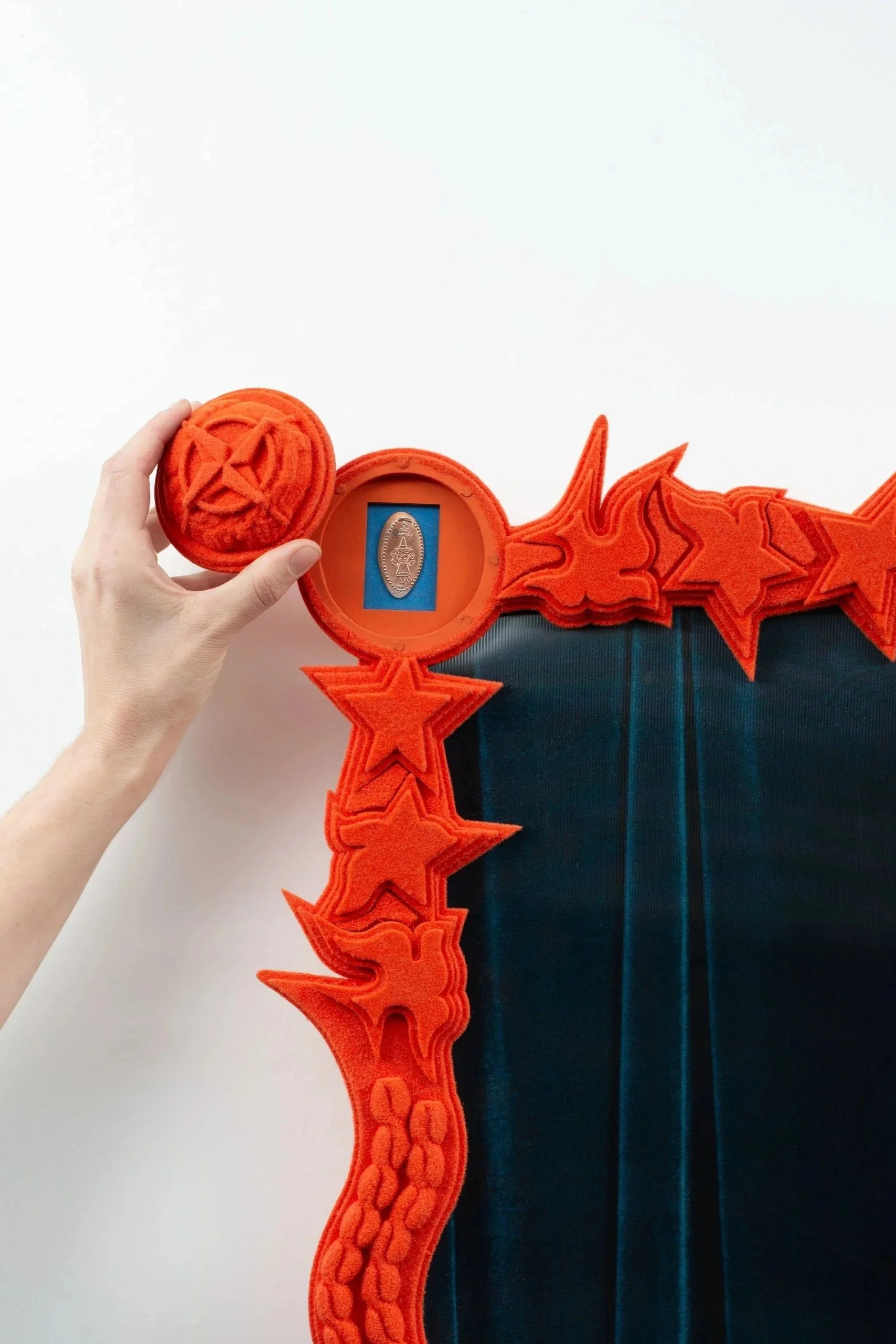 2025, 33in x 46in x 4in, lenticular print, nylon flocking, “earth” glass marble, pressed penny from Disney’s “It’s a Small World,” wood, plaster, magnets