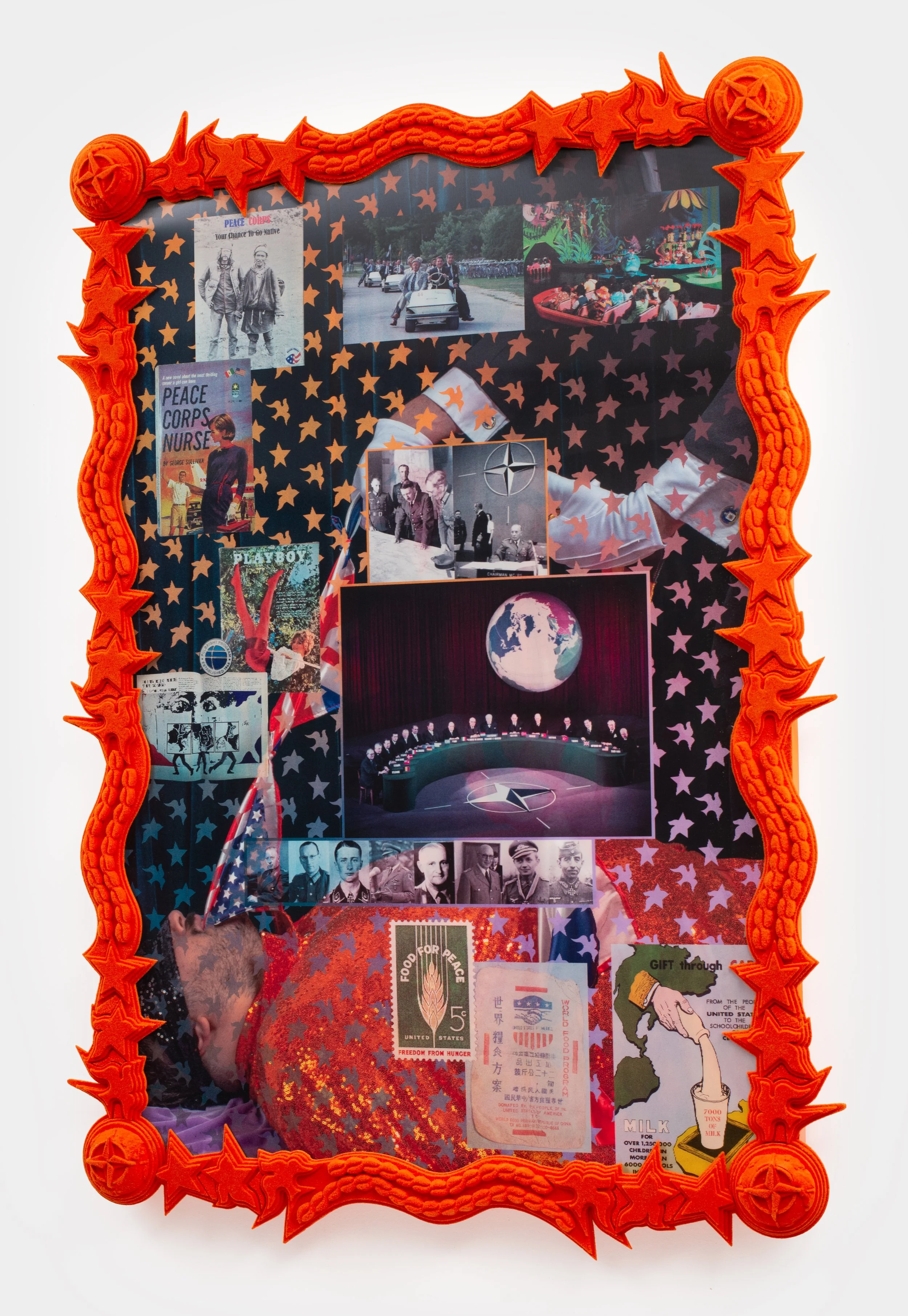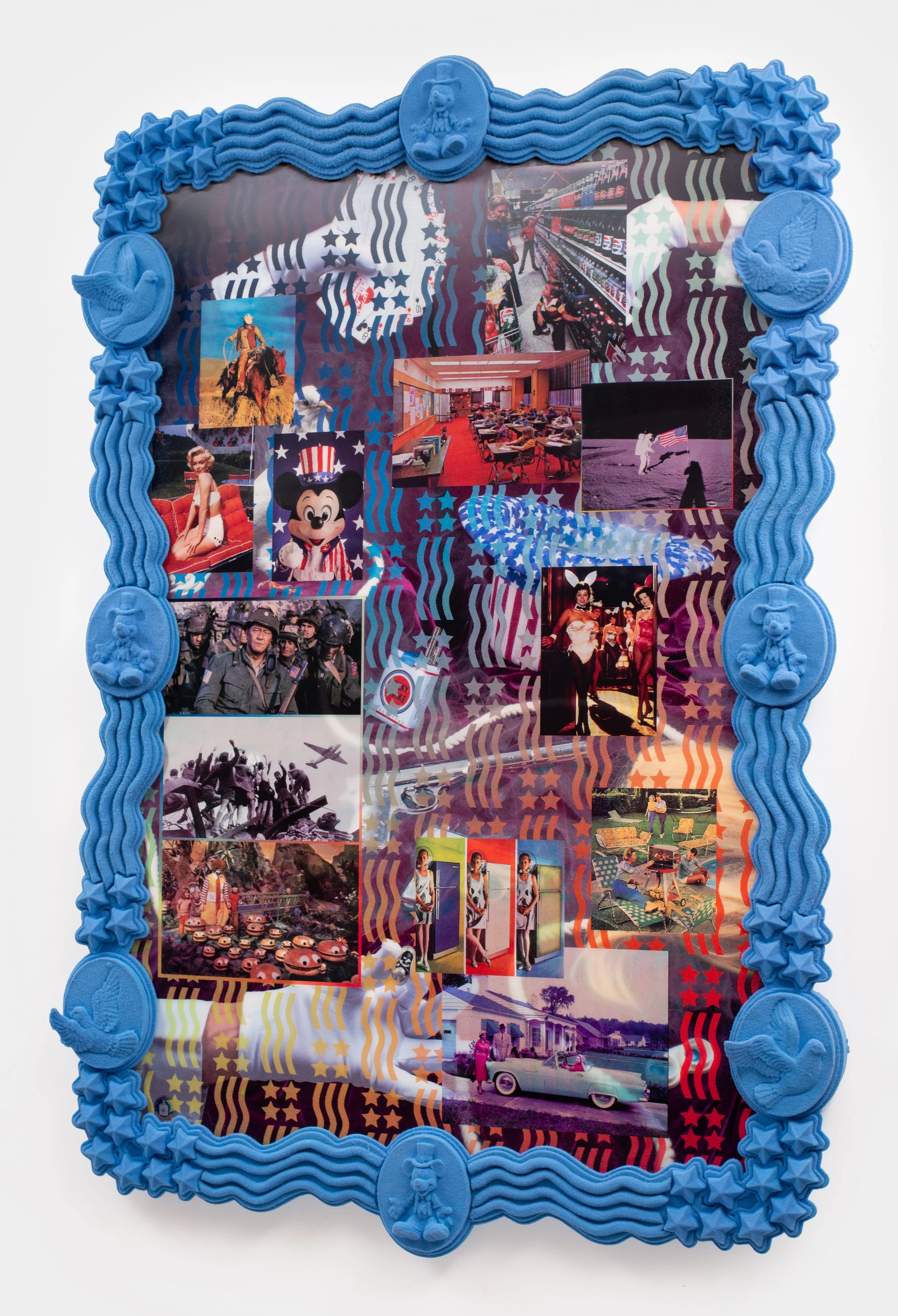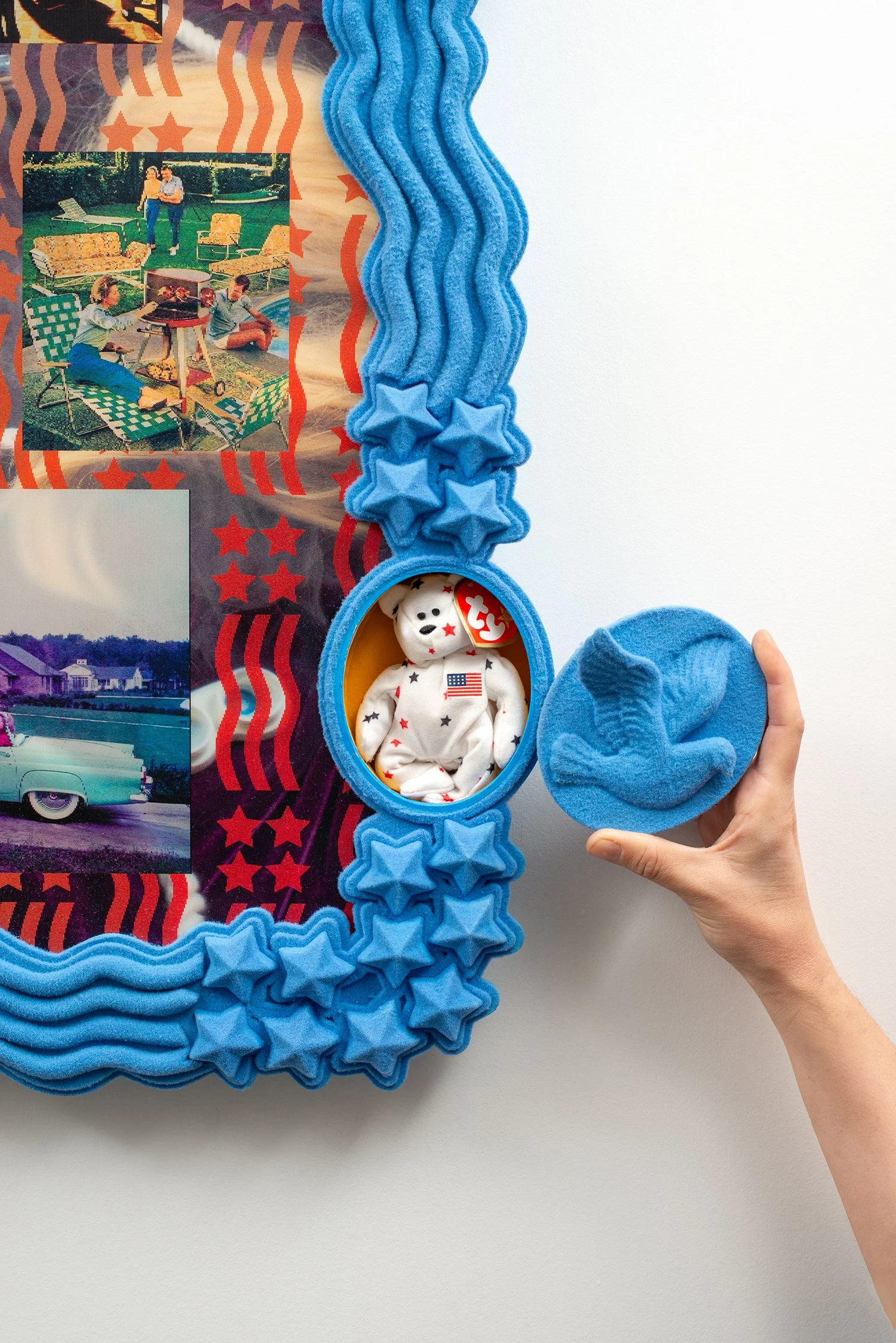 2025, 33in x 46in x 4in, lenticular print, nylon flocking, 4th of July-themed mini beanie baby McDonalds toy, glitter-filled pill, wood, plaster, magnets