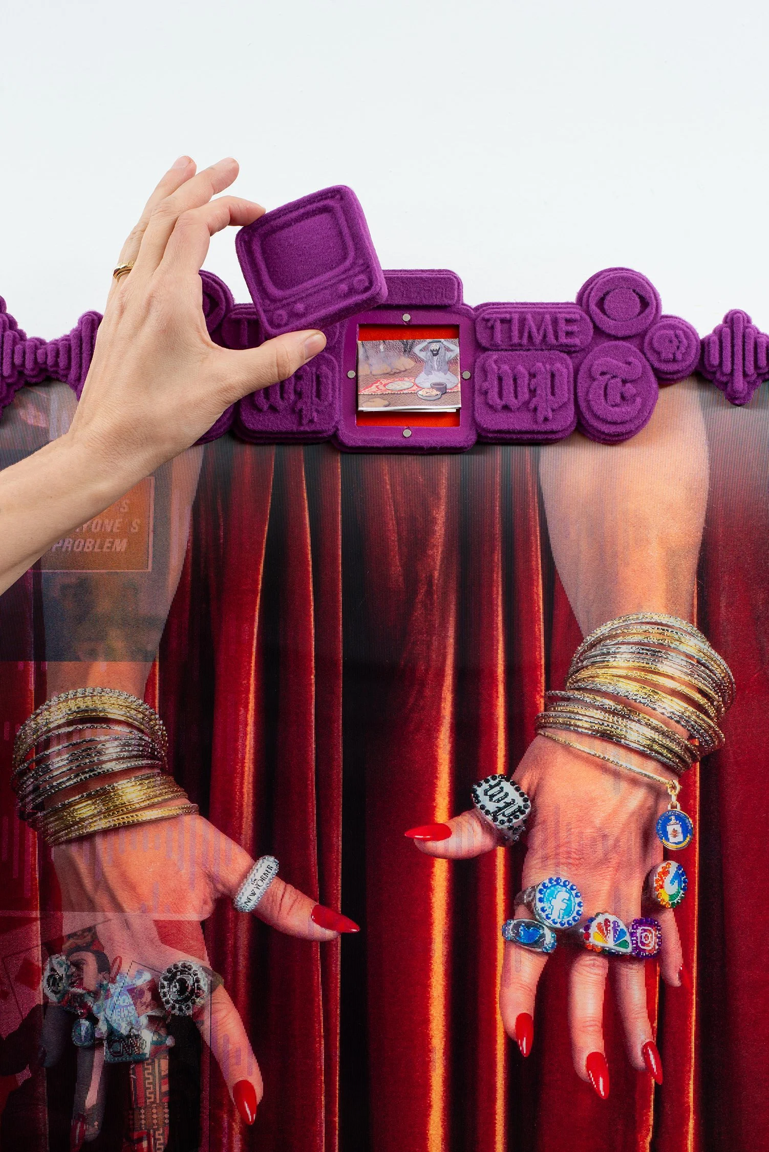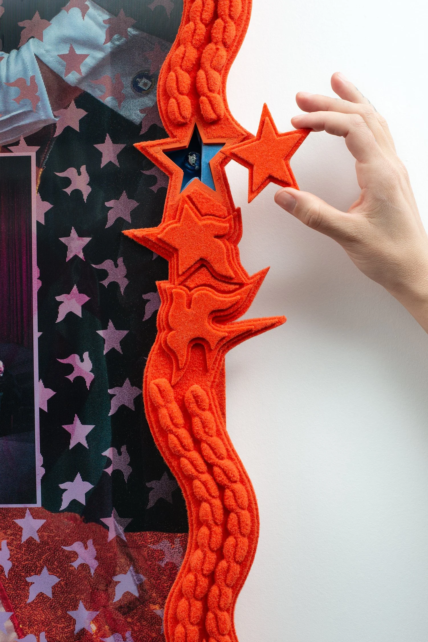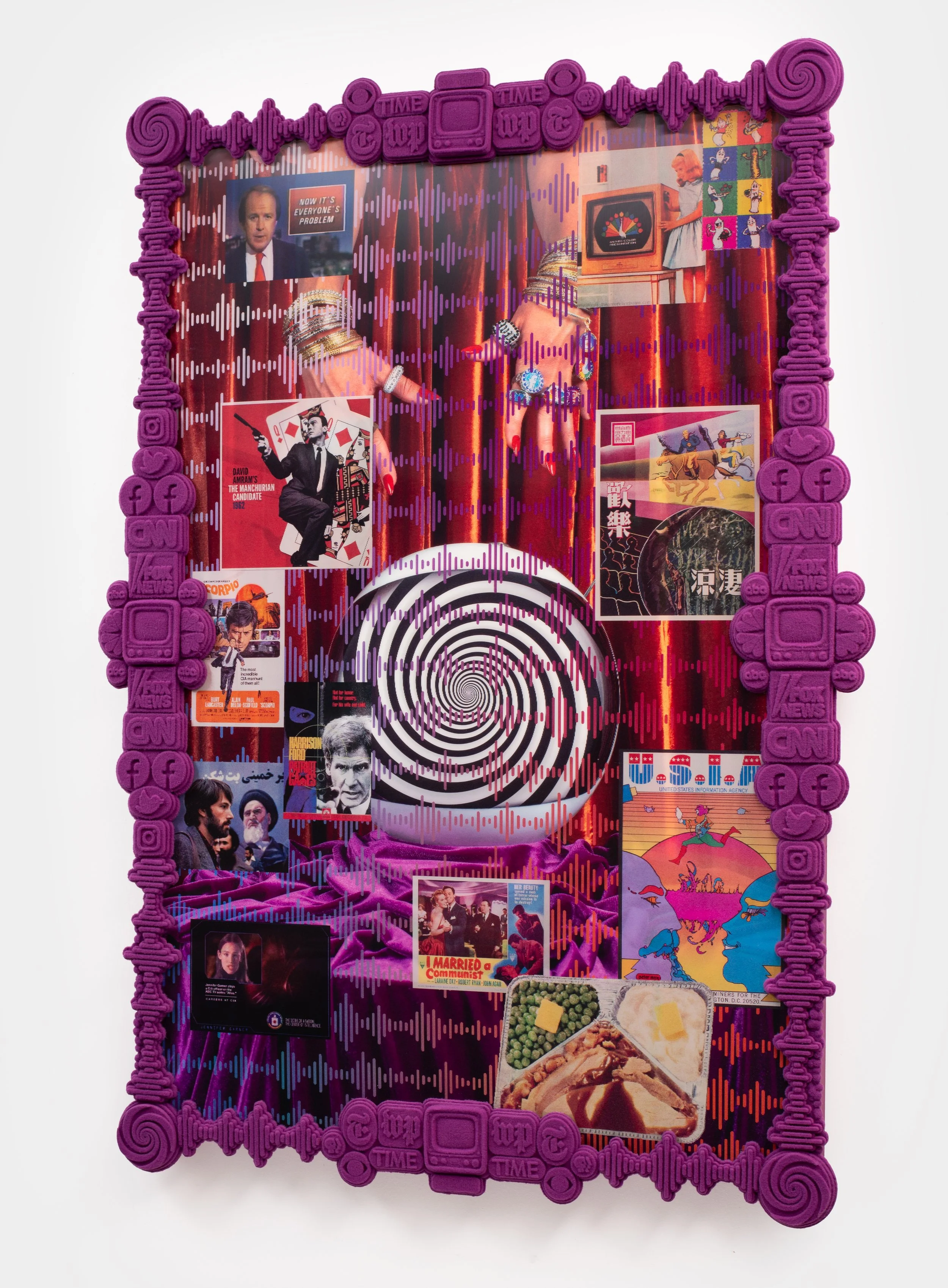 2025, 33in x 46in x 4in, lenticular print, nylon flocking, 4th of July-themed mini beanie baby McDonalds toy, glitter-filled pill, wood, plaster, magnets