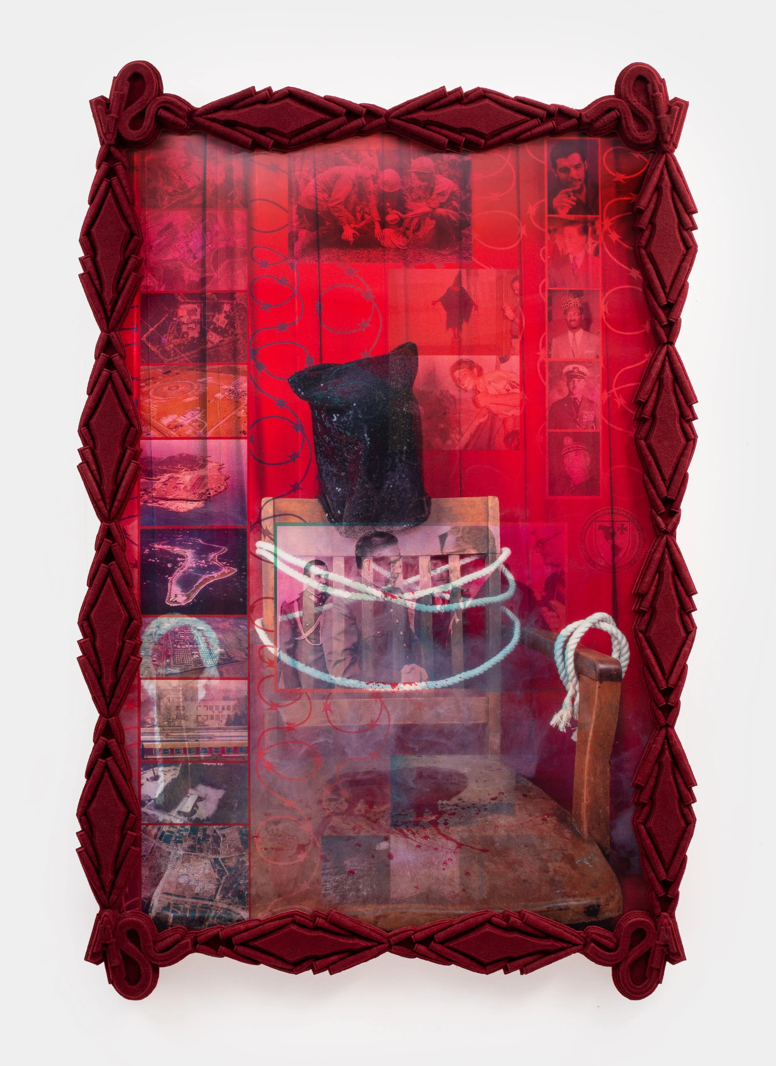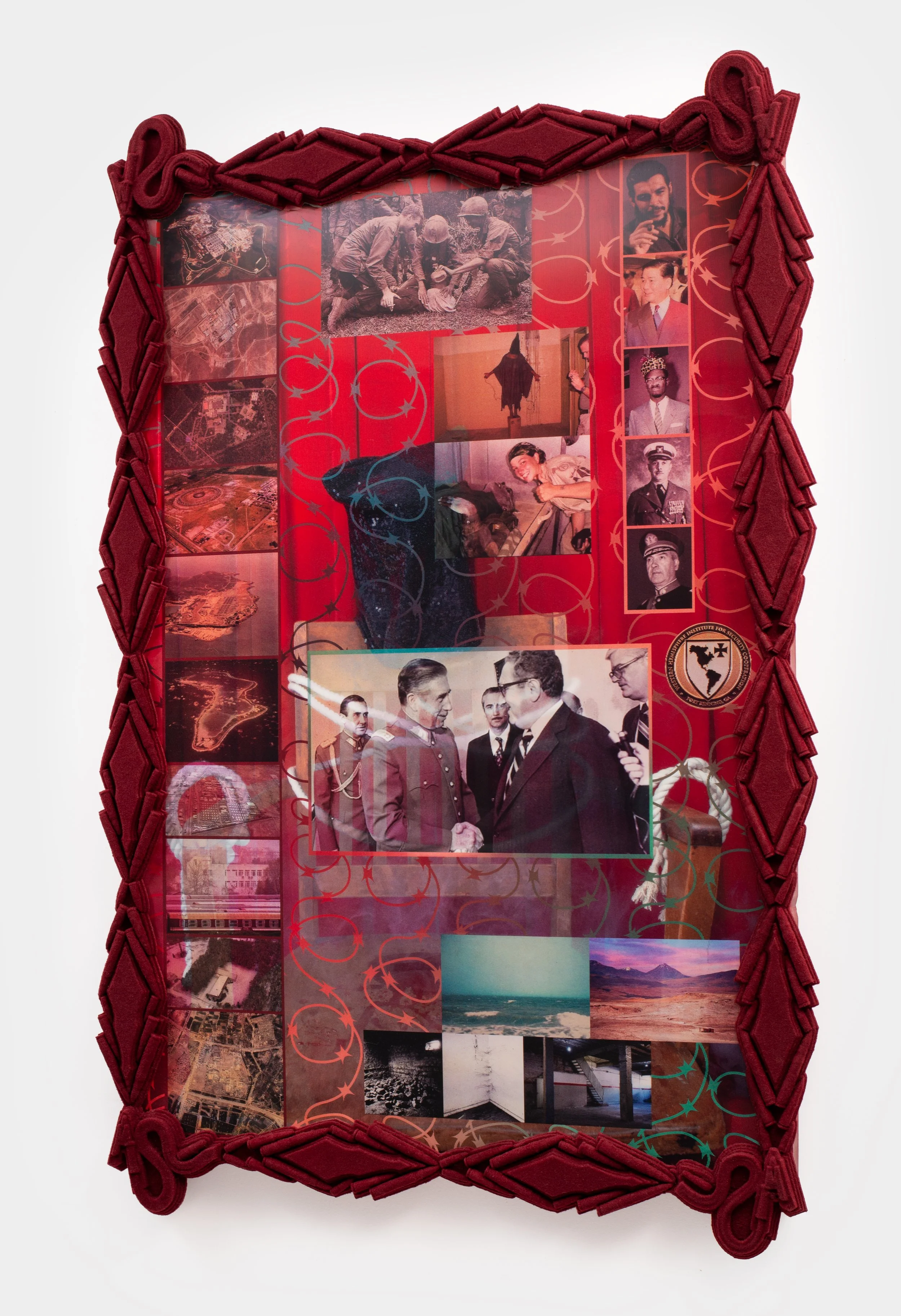 “Vanishing Acts” references the CIA practice of disappearing enemies. The lenticular image shifts from a magician’s trick chair to a collage of images from Abu Ghraib and Guantanamo Bay, CIA black sites detention and torture centers as part of Operation Condor and political leaders assassinated by the US. The frame features two secret compartments containing an engraved bullet casing with names of leaders assassinated by the US and an authentic instructors enamel pin from School of the Americas.