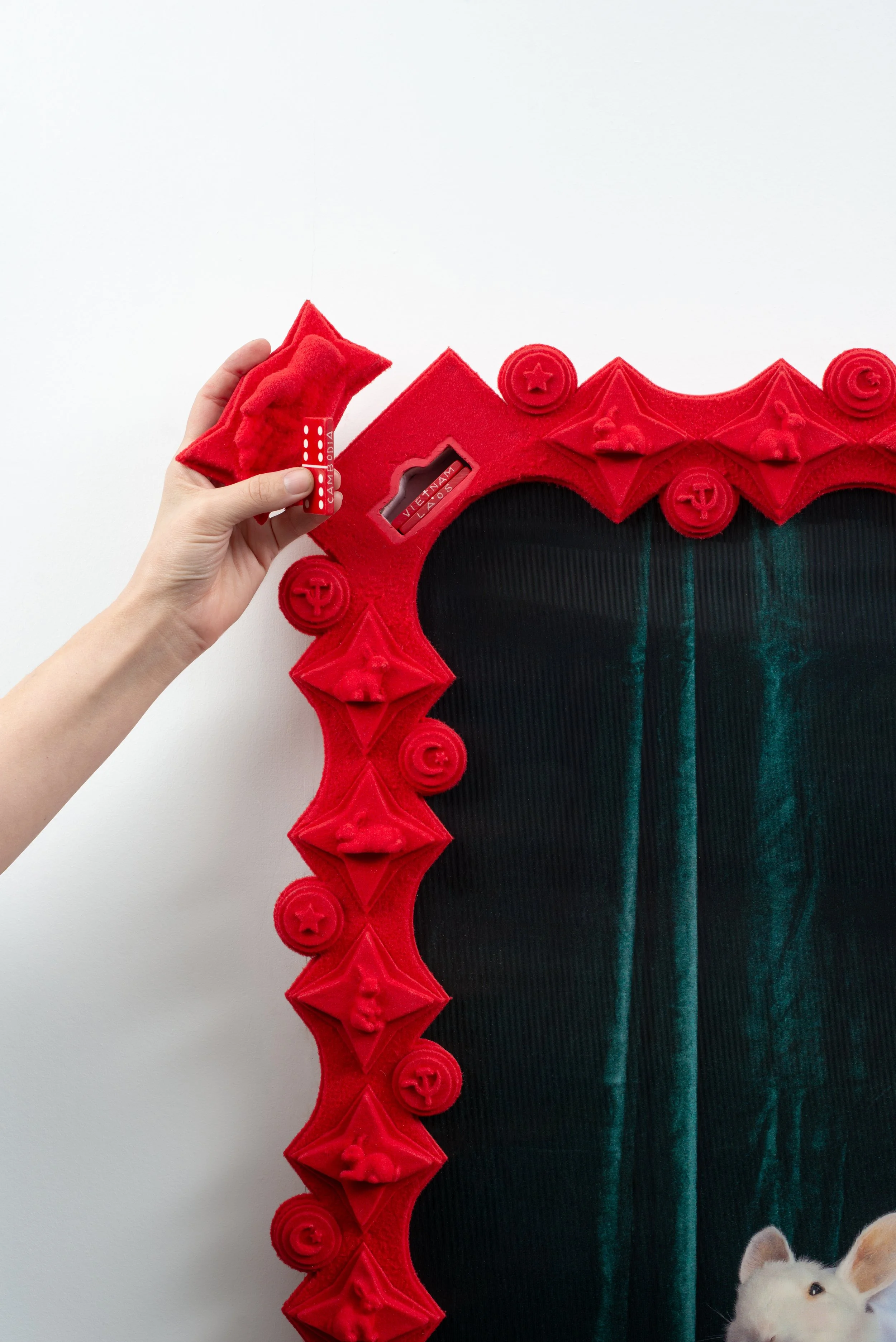 2025, 33in x 46in x 4in, lenticular print, nylon flocking, rabbits foot, set of 3 etched dominos, wood, plaster, magnets
