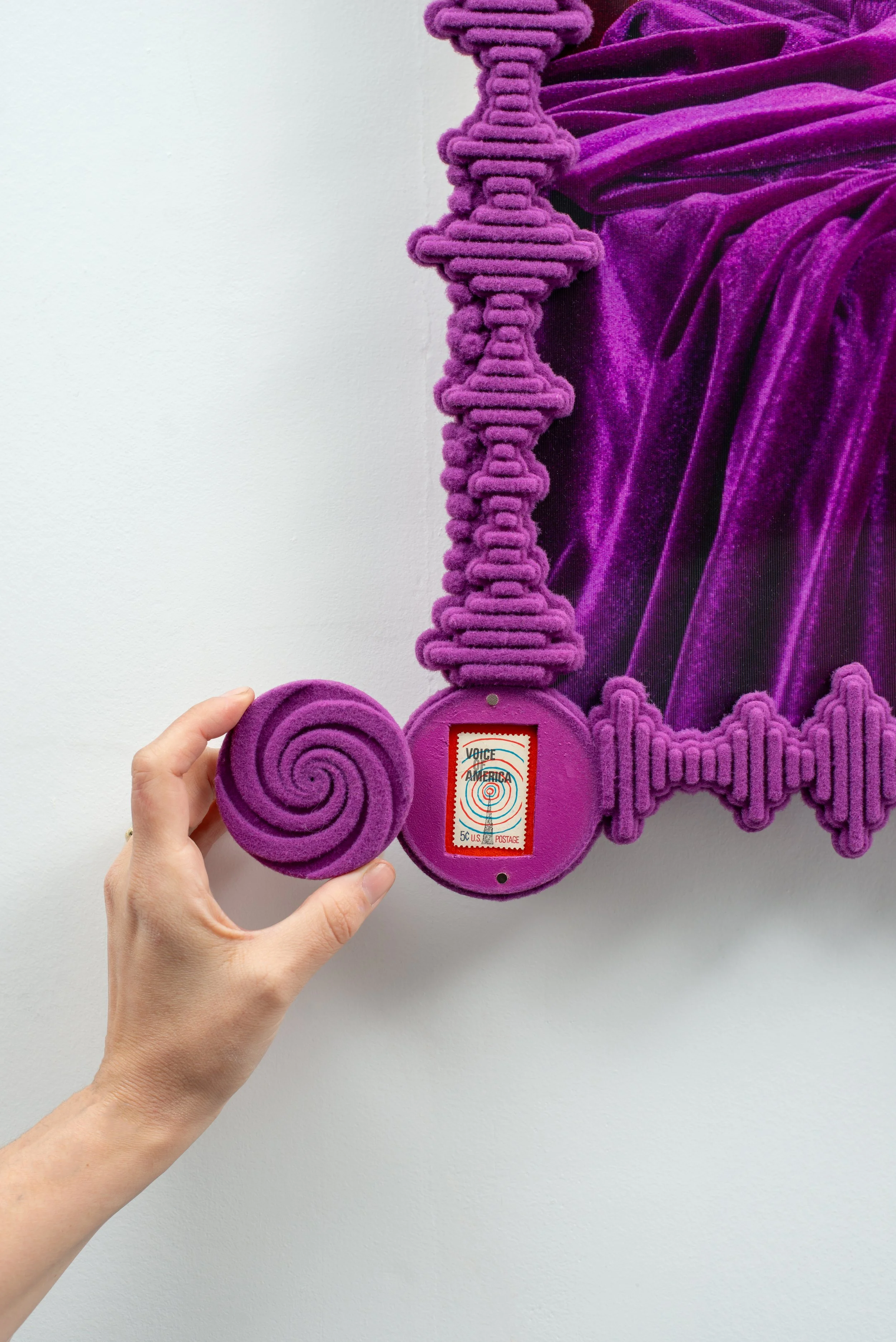 2025, 33in x 46in x 4in, lenticular print, nylon flocking, US PSYOP Leaflet from Afghanistan, “Voice of America postage stamp, wood, plaster, magnets