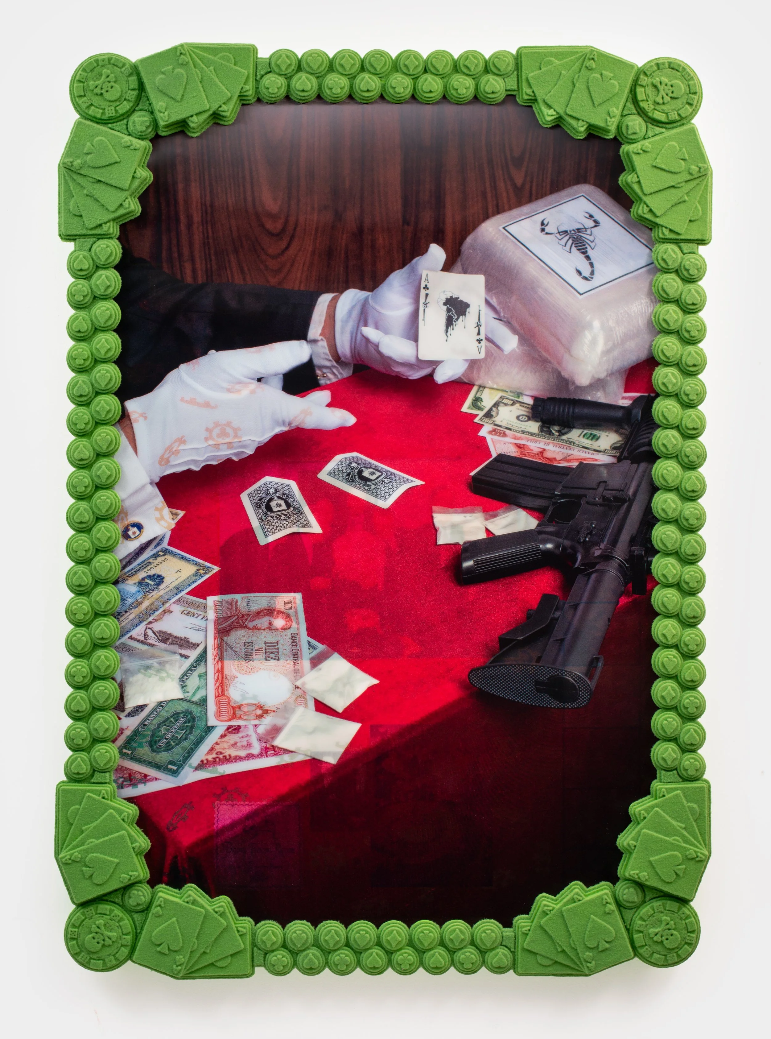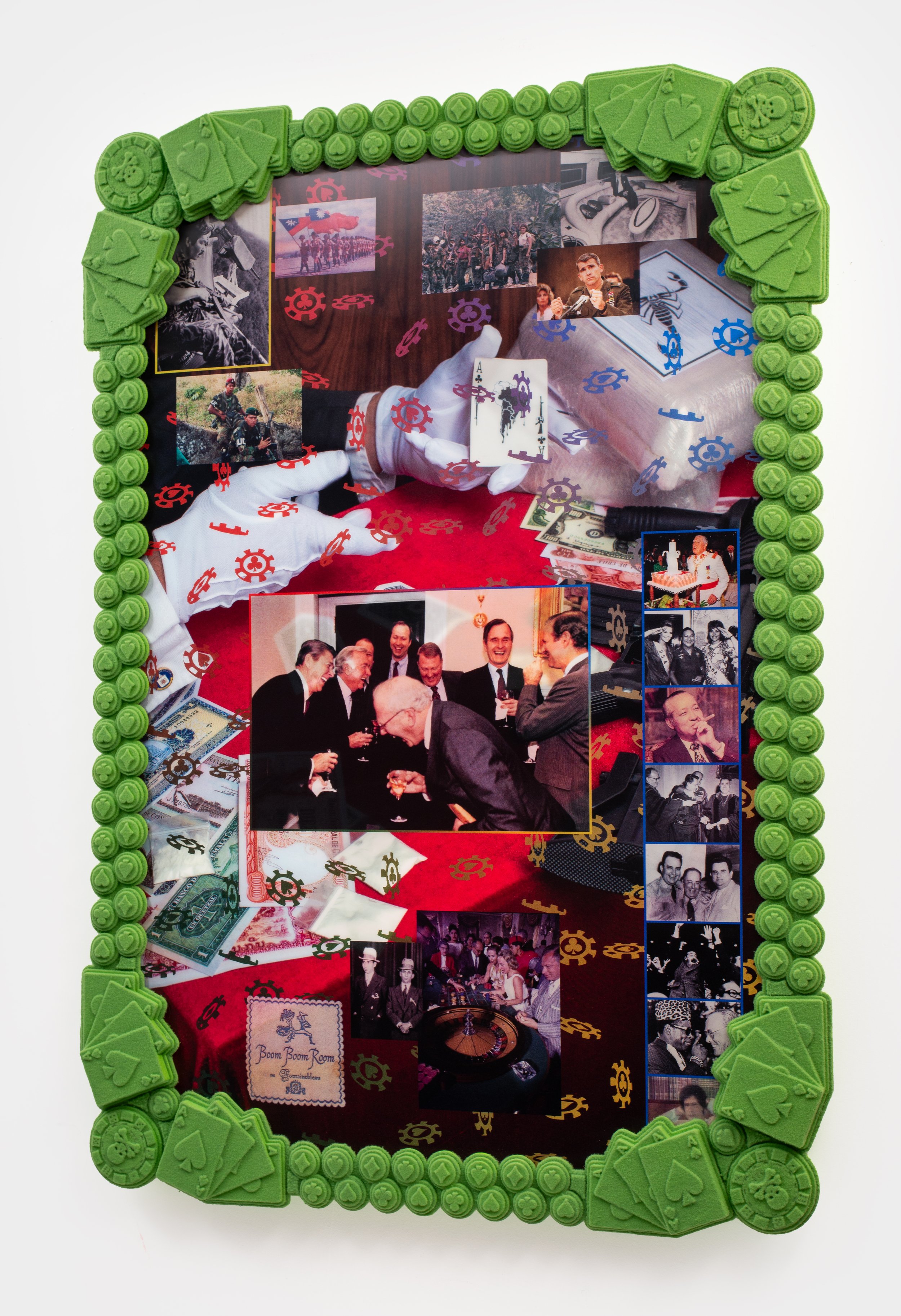 “Sleight of Hand” references hand-in-glove collusion and backdoor deals between the US government and corporate interests. Imagery depicts a magician playing 3 Card Monte but, depending on the viewing angle, shifts to reveal images of: arms dealers; Italian mobsters on the CIA payroll; various US-backed narco-trafficking rebel groups; and US-backed dictators enjoying themselves. The frame features 2 secret compartments containing a set of loaded dice and matchbook from Hotel Fontianblue’s Boom Boom Room.