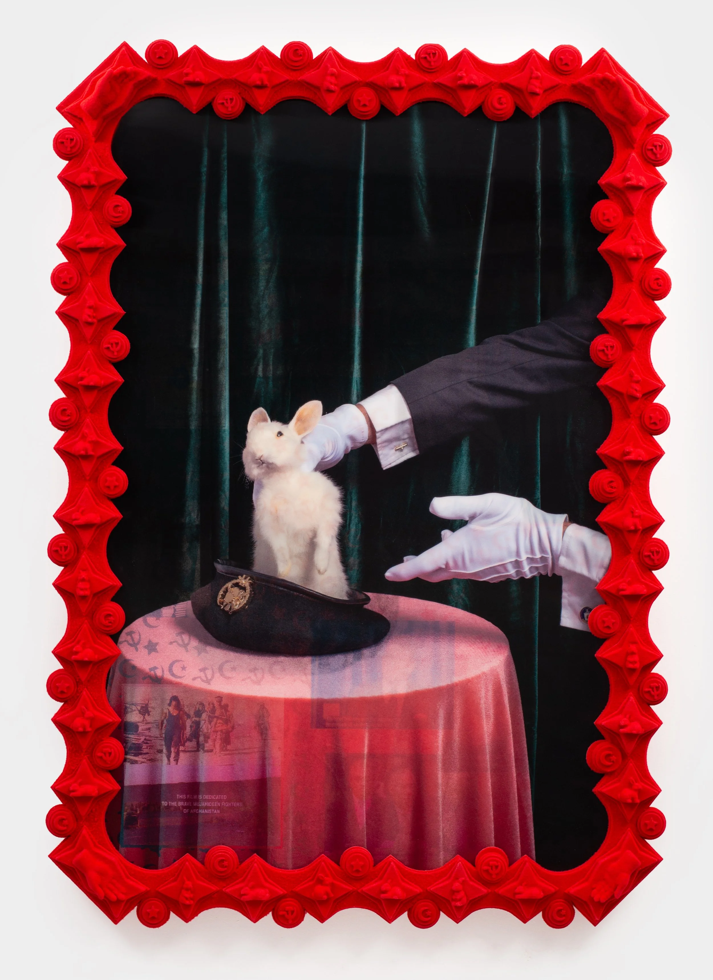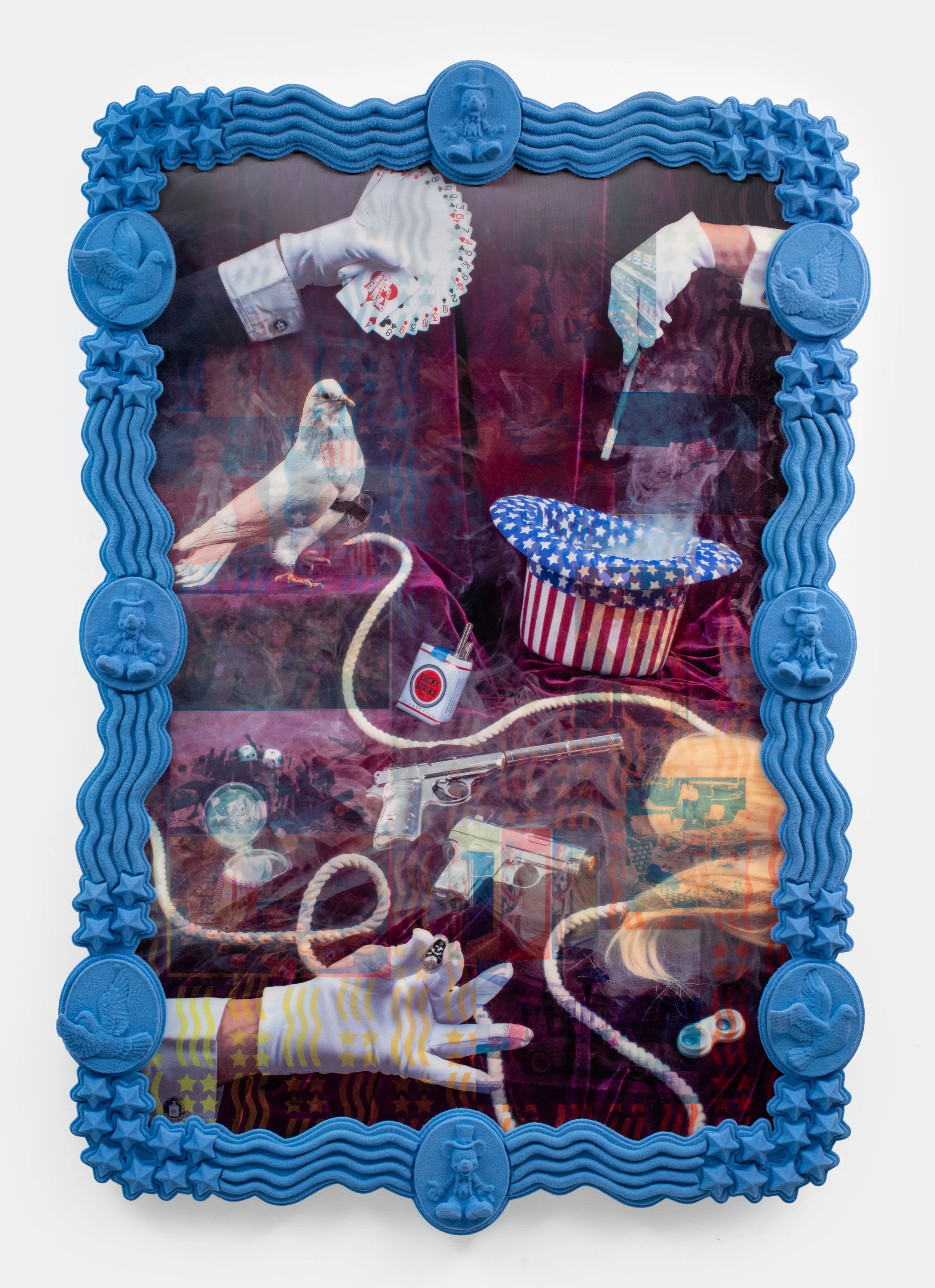 “Collateral Magic“ is an interdisciplinary body of work aimed to provoke critical dialogue about the historical role of propaganda and illusion in shaping American reality.