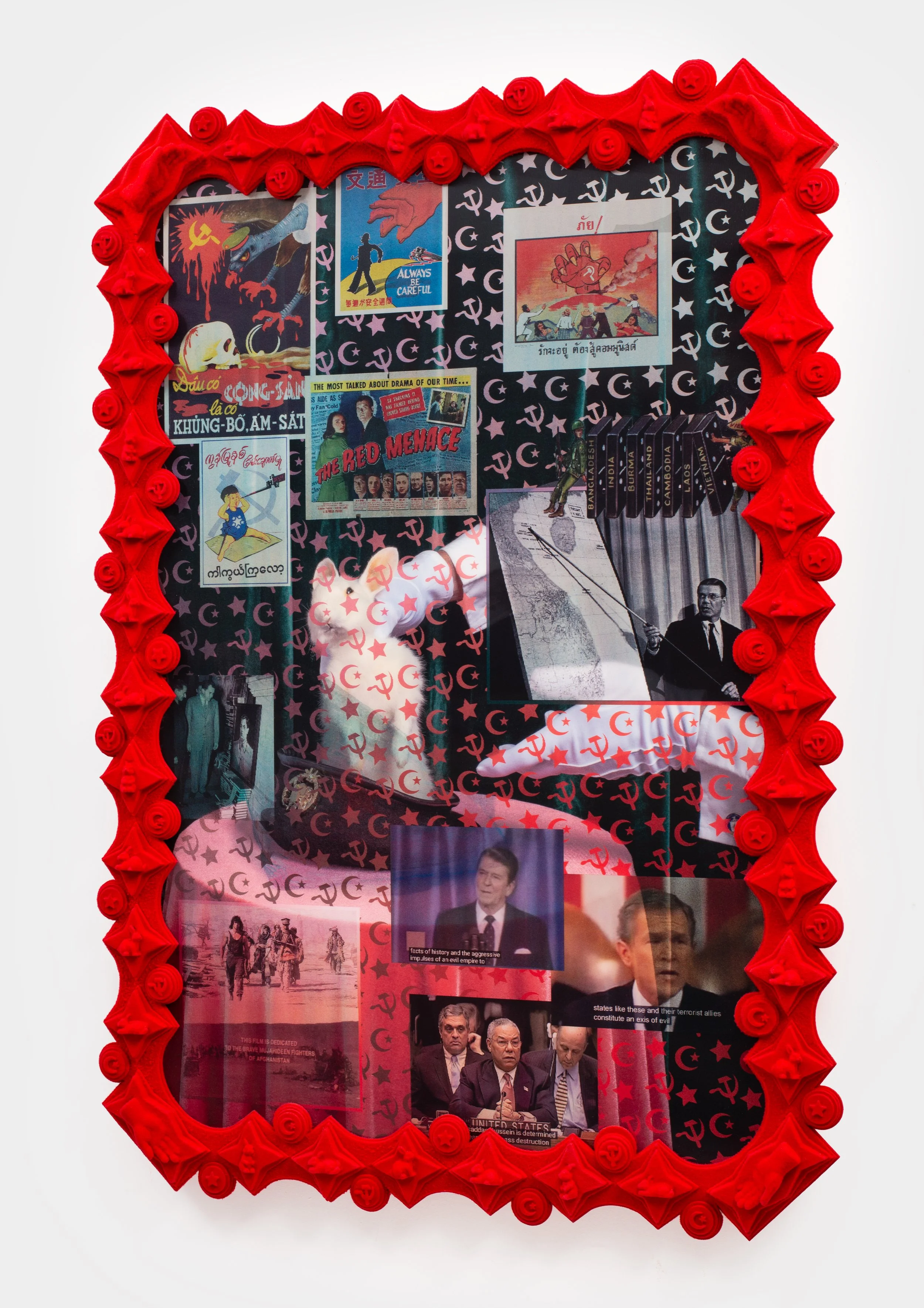 One of 6 lenticular prints referencing different aspects of stagecraft illusion. “Conjuring the Enemy” references US historical justifications for war. Imagery depicts a magician pulling a rabbit out of a hat but depending on the viewing angle, shifts the traditional top hat with a Soviet ushanka, VietCong nóndang or Saddam Hussain’s beret, overlaid with Red Scare propaganda and government officials justifying various US invasions. The frame features 2 secret compartments containing a rabbit's foot and set of 3 dominoes engraved with words “Laos,” “Cambodia” and “Vietnam”.