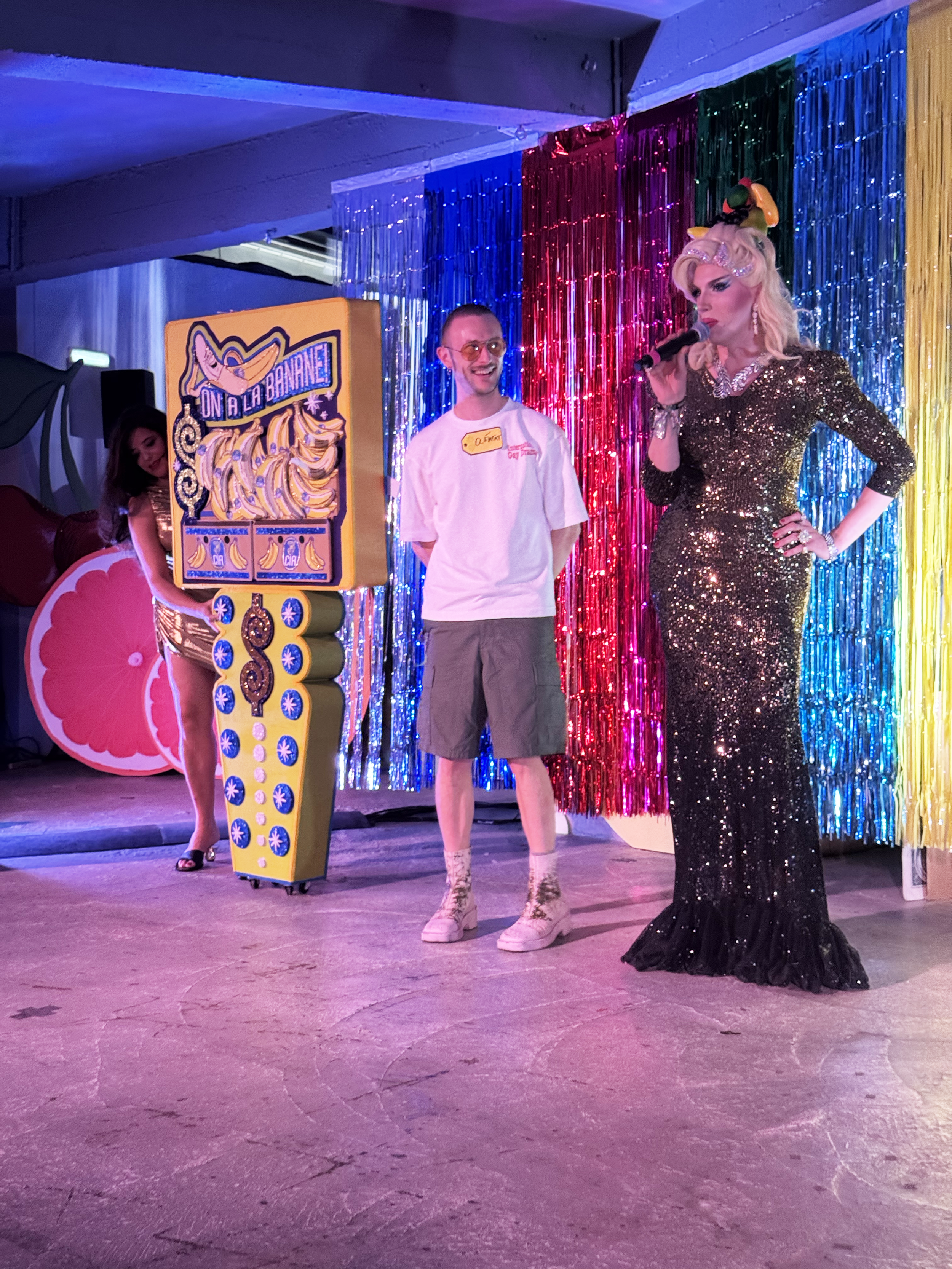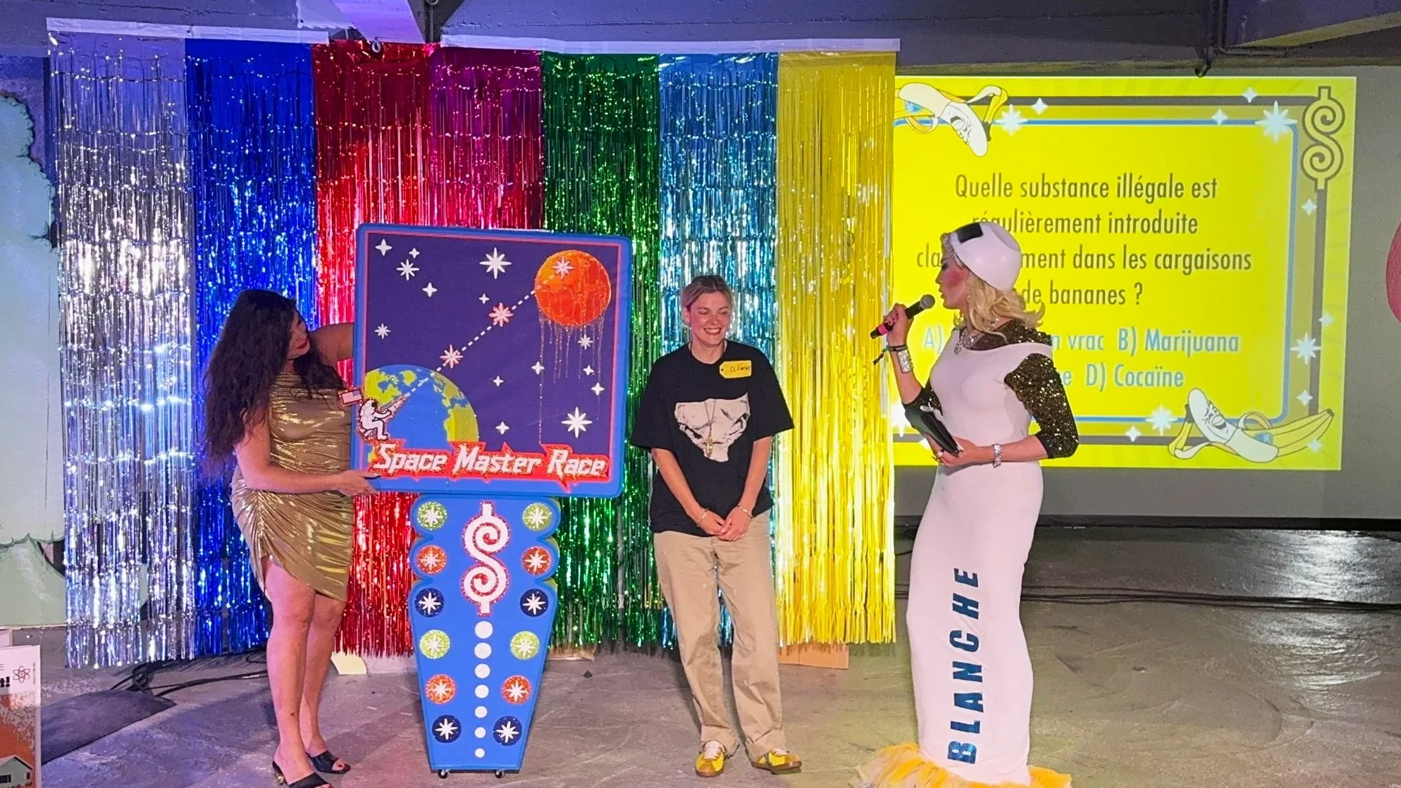 “Le Injuste Prix” was a collaborative, bi-lingual lecture-performance that presented the research behind each of our 5 ¡AGITPOP! Press publications in the form of “The Price is Right” game show. I created oversized stage-prop versions of each book that were used to present our work, followed by four audience-interactive games hosted by performer Blanche Poubelle. Each game was structurally based on one from the iconic game show but curated to correspond to the content of our publications. In “Complot” (Cover-Up) players had to cover up the face of a world leader with the common household item that the CIA had attempted to assassinate them with. In “On A La Banane” (a French phrase meaning “we’re thrilled!”) players chose a banana, which when peeled revealed a trivia question about the history of Banana Republics. In “Space Master Race” players had to correctly guess trivia related to the history of Operation Paperclip (where the US expunged the records of over 1500 Nazi scientists to start NASA) in order to get their astronaut to Mars. And in “Blanchiment d’ Argent” (Money Laundering) players opened up a washing machine to extract a sparkly dollar bill with trivia about the history of US corporate-military collusion. Sound effects / music from the original game show were used, and players one a variety of prizes sourced from other vendors at the Paris-Ass Book Fair.