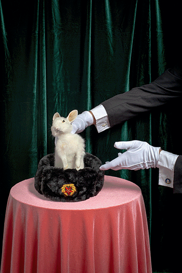 Each lenticular print references a different aspect of stagecraft illusion: vanishing acts, sleight-of-hand, conjuring, mentalism, rope tricks, and creating an atmosphere of magic. A photographic image–where magician hands interact with stage props–is overlaid with collaged imagery of real-world propaganda related to each theme.